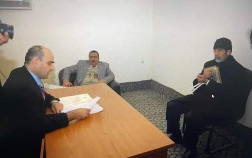 Dönemin başsavcısı Munkiz al-Faraun içerideki bir koltukta oturuyor. Yargıç Haddad ise karşısında oturan Saddam’a temyiz kararını tebliğ ediyor.
