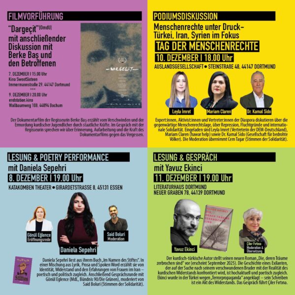 Programın öne çıkan etkinliklerinden biri, 43. İstanbul Film Festivali’nde En İyi Belgesel Ödülü’nü kazanan “Dargeçit” belgeselinin gösterimleri olacak. Yönetmen Berke Baş tarafından çekilen film, 1995 yılında Mardin’in Dargeçit ilçesinde gözaltında kaybedilen üçü çocuk yedi kişinin ailelerinin yıllara yayılan adalet mücadelesini izleyiciye aktarıyor. Belgesel, yalnızca dava sürecine değil; 13 yaşındayken annesinin gözü önünde işkence gören Davut Altınkaynak’ın hikâyesine ve toplumsal hafızanın karanlık sayfalarına da ışık tutuyor. Gösterimler 5-9 Aralık arasında Ruhr bölgesinin çeşitli kentleri ile Köln’de yapılacak; film sonrası söyleşilere yönetmen Berke Baş, tanık Hazni Doğan, Hafıza Merkezi’nden Olcay Özer ve Avukat Esra Kılıç katılacak.