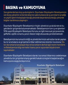 Diyarbakır Büyükşehir Belediyesi olarak, kurumsal itibarımızı zedelemeye yönelik bu tür girişimlere karşı gerekli hukuki süreçlerin başlatılacağını kamuoyuna saygıyla duyururuz.”