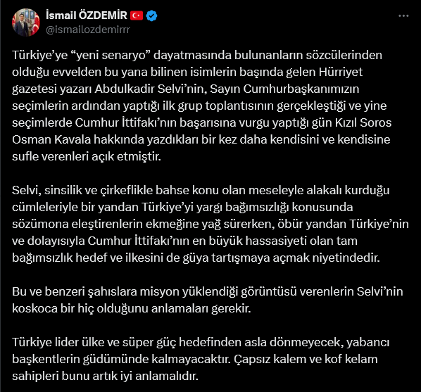 MHP’nin Medya, Tanıtım ve Halkla İlişkilerden Sorumlu Genel Başkan Yardımcısı ve Kayseri Milletvekili İsmail Özdemir, X hesabından yaptığı paylaşımda; “Türkiye’ye “yeni senaryo” dayatmasında bulunanların sözcülerinden olduğu evvelden bu yana bilinen isimlerin başında gelen Hürriyet gazetesi yazarı Abdulkadir Selvi’nin, Sayın Cumhurbaşkanımızın seçimlerin ardından yaptığı ilk grup toplantısının gerçekleştiği ve yine seçimlerde Cumhur İttifakı’nın başarısına vurgu yaptığı gün Kızıl Soros Osman Kavala hakkında yazdıkları bir kez daha kendisini ve kendisine sufle verenleri açık etmiştir.