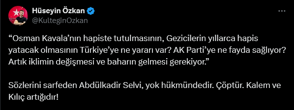MHP Sosyal Medya Sorumlusu Hüseyin Özkan da Selvi için; “Osman Kavala’nın hapiste tutulmasının, Gezicilerin yıllarca hapis yatacak olmasının Türkiye’ye ne yararı var? AK Parti’ye ne fayda sağlıyor? Artık iklimin değişmesi ve baharın gelmesi gerekiyor.” Sözlerini sarfeden Abdülkadir Selvi, yok hükmündedir. Çöptür. Kalem ve Kılıç artığıdır!” açıklamasında bulundu.