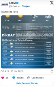 İstanbul Büyükşehir Belediyesi (İBB) Afet Koordinasyon Merkezi (AKOM), haftalık hava tahmin raporunu paylaştı.