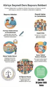 🔴 Milli Eğitim Bakanlığı, 2026-2027 eğitim-öğretim yılı seçmeli ders sürecinde tercihlerin 20 Şubat’a kadar sisteme girilmesi gerektiğini duyurdu. Kürtçe derslerinde sınıf açılabilmesi için en az 10 öğrenci şartı sürüyor.