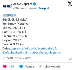AFAD verilerine göre Kütahya’nın Simav ilçesinde saat 17.31’de 4,8 büyüklüğünde deprem meydana geldi. Sarsıntı yerin 9,12 kilometre derinliğinde kaydedildi.