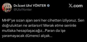 Yönter’in geçen saatlerde yaptığı “MHP’ye sızan ajan seni her cihetten izliyoruz. Sen doğruluktan ne anlarsın! Merak etme seninle mutlaka hesaplaşacağız…Paran da işe yaramayacak dümenci alçak…” paylaşımı dikkat çekmişti.