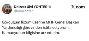 Yönter, “Gördüğüm lüzum üzerine MHP Genel Başkan Yardımcılığı görevinden istifa ediyorum. Kamuoyunun bilgisine arz ederim” ifadeleriyle istifasını duyurdu.