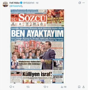 Gazetenin “İmamoğlu iddianameyi iftira olarak niteledi: Ben ayaktayım” şeklindeki manşetinin Yıldız tarafından paylaşılmış olması dikkat çekti.