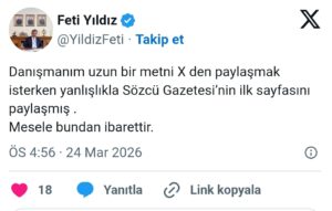 Feti Yıldız’ın paylaşımını yaklaşık yarım saat sonra profilinden sildiği görüldü. Yıldız hemen ardından yaptığı açıklamada ise paylaşımın danışmanı tarafından yanlışlıkla yapıldığını ifade etti ve şunları söyledi: