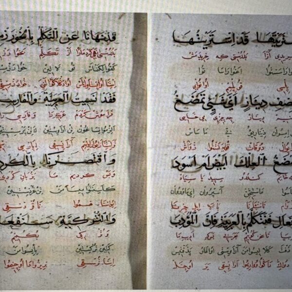 İstanbul Ayasofya Kütüphanesinde bulunan ve 1400-1500 yılları arasında yazıldığı belirtilen “Arapça-Farsça-Grekçe-Sırpça-Kürdçe-Harezmce” isimli çok dilli sözlükten bir yaprak (Kaynak: Hemdad Arwandi, 15/02/2026).
