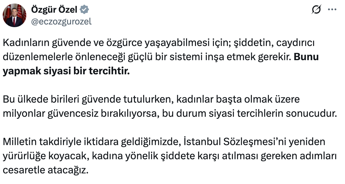 Özel, kadına yönelik şiddetin önlenmesinin siyasi irade gerektirdiğini vurguladı. CHP lideri, iktidara gelmeleri halinde İstanbul Sözleşmesi’ni yeniden yürürlüğe koyacaklarını belirterek, kadına yönelik şiddetle mücadelede kararlı adımlar atacaklarını söyledi.
