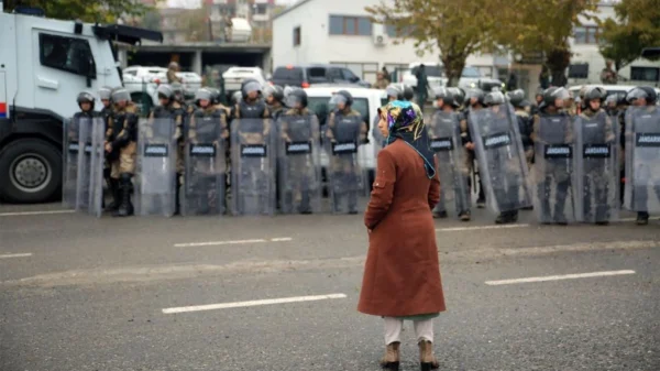 9 Aralık 2019; Eşbaşkan Hatice Taş, gasp edilen Awîskê belediyesi önünde. (Foto: Metin Yoksu)